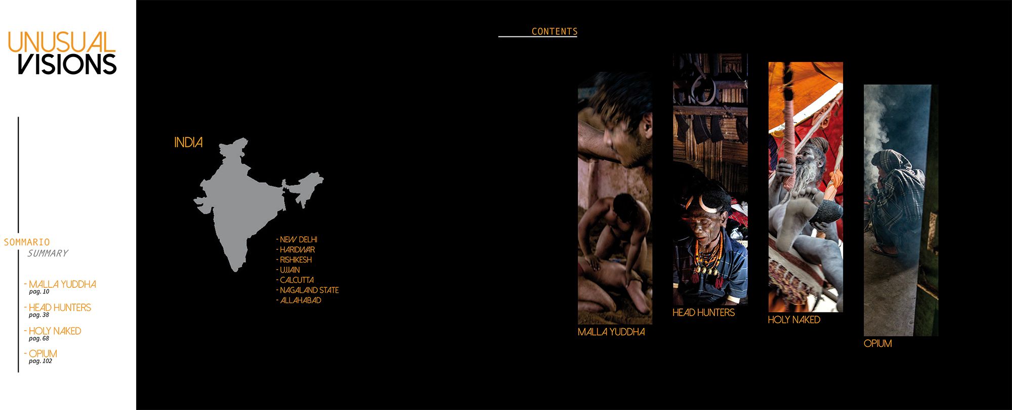 This book gathers together four different reportages, four stories of another India, different, unusual, and sometimes far from the collective imagination. The last Head Hunters of Nagaland (a group of warriors who, to increase their own power in the village, used to carry out the ritual decapitation of the enemy); The Malla Yuddha, the ancient Indian wrestling in mud; The "Naga Baba" the highest expression of Indian asceticism, and the scourge of opium in the Indian-Myanmar border, where a third of the men of these villages are now addicted and slaves to opium.