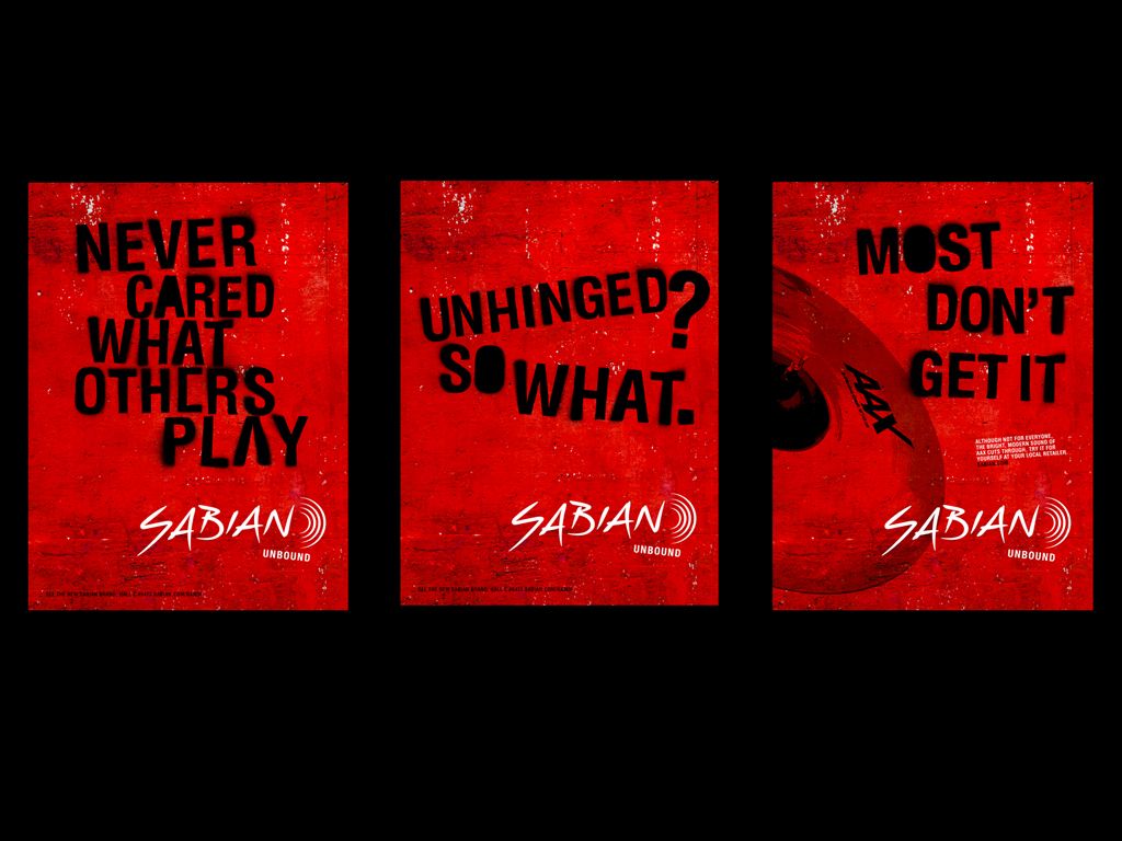 Worldwide behavioral research conducted by Stealing Share revealed that drummers are always looking to do their own thing and like being thought of as a little unhinged. They don't like to be thought of as followers yet most drummers play the number one brand of cymbals. From the logo to the advertising campaign and everything in between, Stealing Share created a new brand for Sabian from the ground up based on what drives drummers so they'll choose Sabian instead of the one the crowd follows.