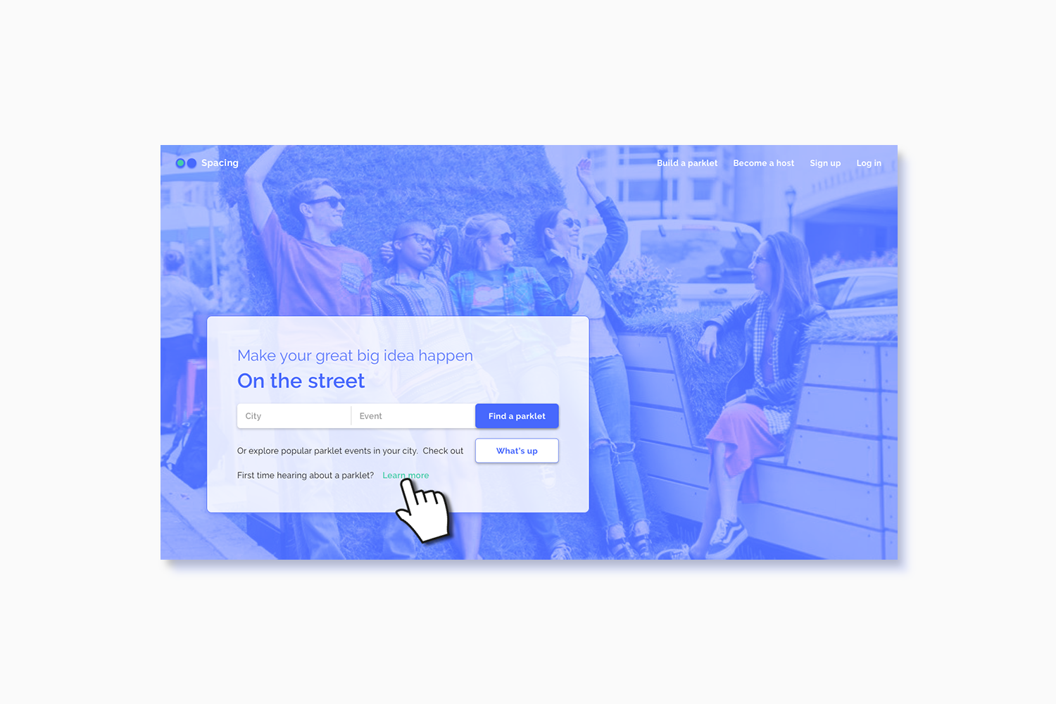 • Spacing is a platform for people renting parklets to test their brilliant ideas and hold events (project main focus).• Spacing helps business and property owners build parklets and become parklet hosts.• It is also a website for people to look up the parklet events around them.Spacing is an independent research and design sprint exploring how on-street parking lanes could be used in more diverse and valuable ways during the transition to an era of autonomous vehicles.
