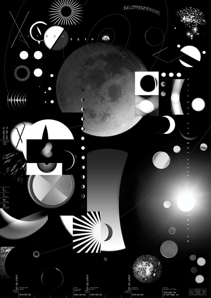 This complex black and white "photo construction", from Californian photographer & graphic-designer Martin Venezky is the base of a close collaboration with visual designer Jean-Benoit Levy who initiated the project in order to create a poster for the celebration of the 50 years of the first step of the men on the moon. An esthetical composition of various images of planets, space imagery and technological elements are building with lines, spiral, and typographical elements, such as a countdown, the sentence left on a plate on the lunar module, and some data-facts a poetical and unique poster