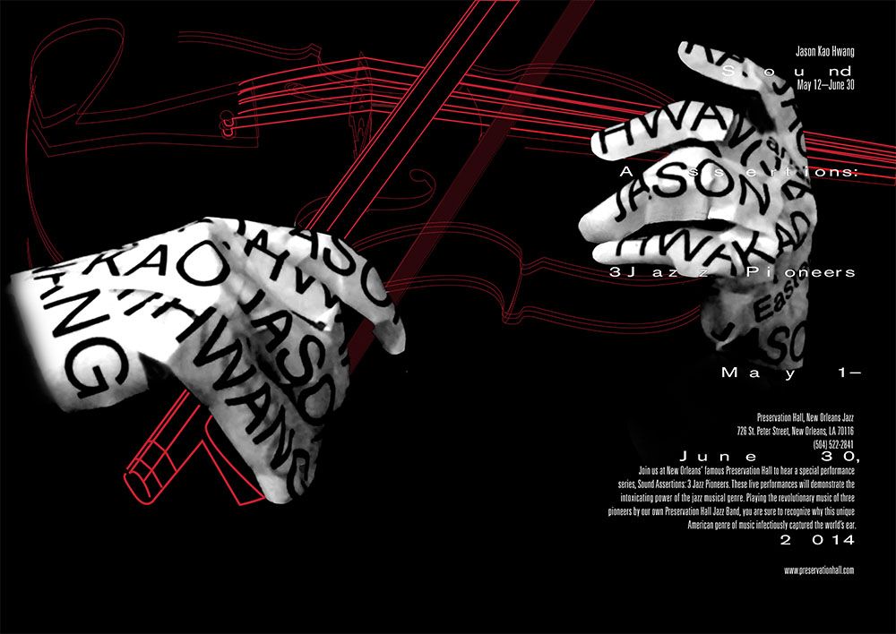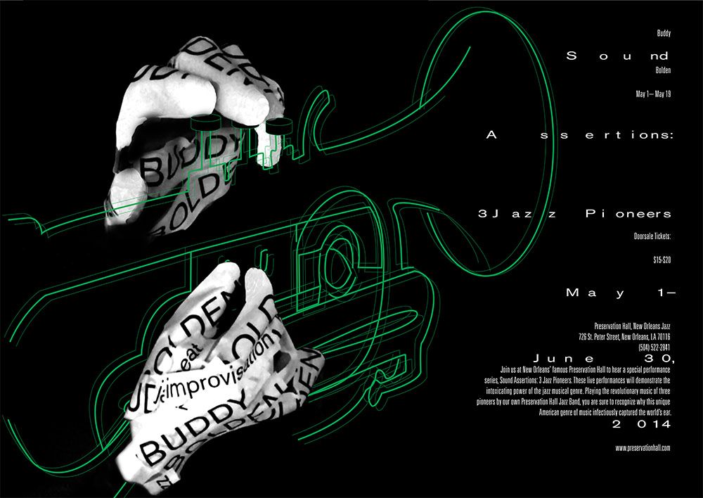 Jazz Hands is a series representing three impactful musicians contributing various sounds to the jazz genre. The series represents each musician’s distinct jazz sound and the emotional impact they portray. They are posters promoting a fake performance series playing compositions demonstrating music by Buddy Bolden, Fats Waller, and Jason Kao Huang. The hands in each piece represent the musicians while the instruments are created from lines which represent the mood and energy the music brings. The information represents different rhythmic syncopations each musician contributes to the jazz genre