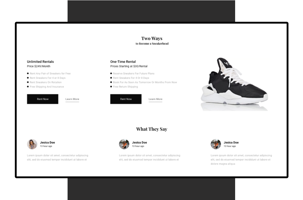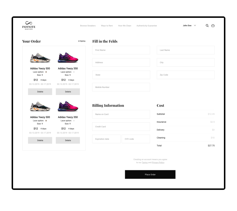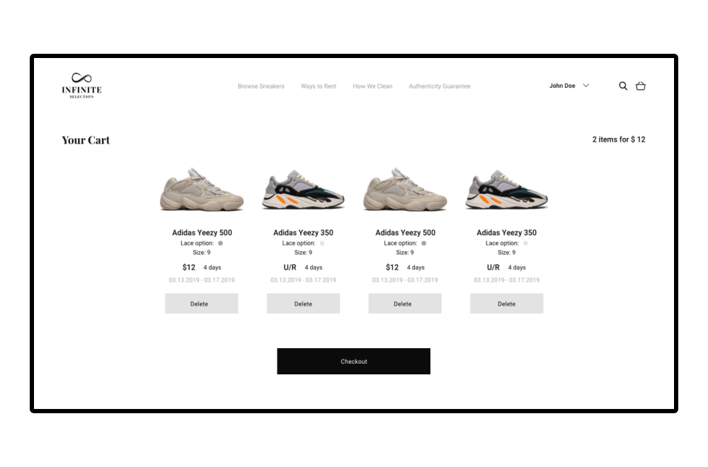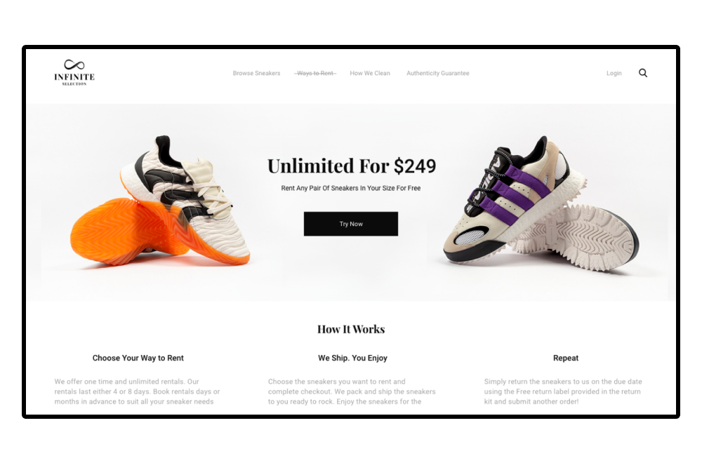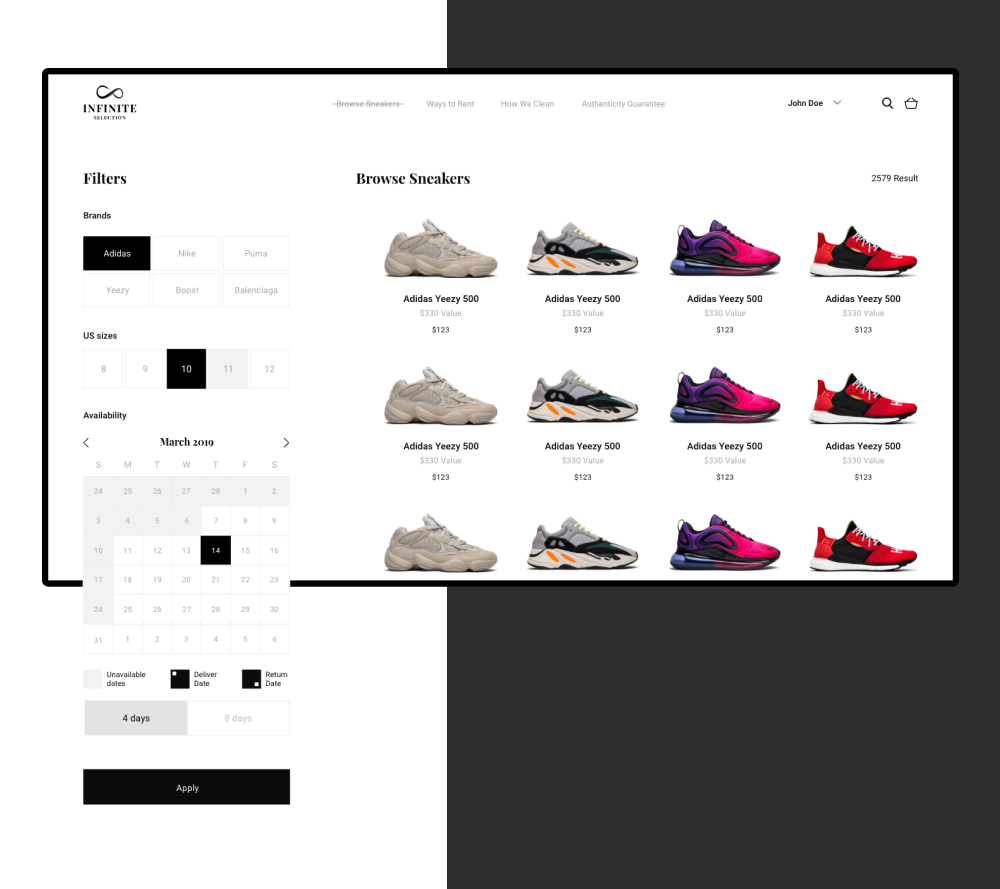 Infinity Selection is an e-commerce platform for renting shoes. The minimalistic, black&white color scheme of the brand was chosen to highlight the contemporaneity of the project and to attract the young target audience. The logo looks like the sign of infinity and illustrates the endless exchange process, which is the main goal of the project. The main challenge in creating the UI/UX design of the platform was to make the flow of choosing the shoes and check out as fast as possible.