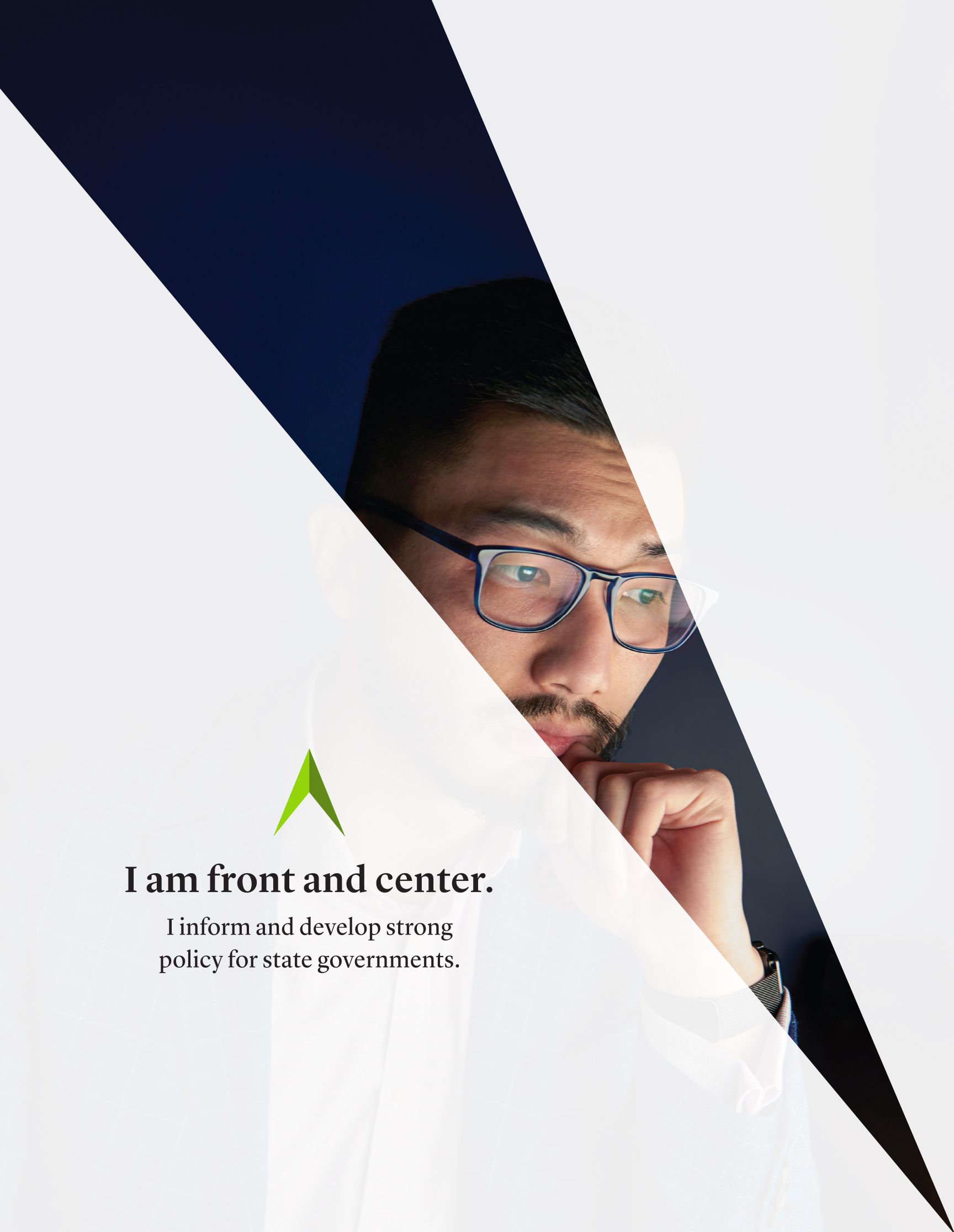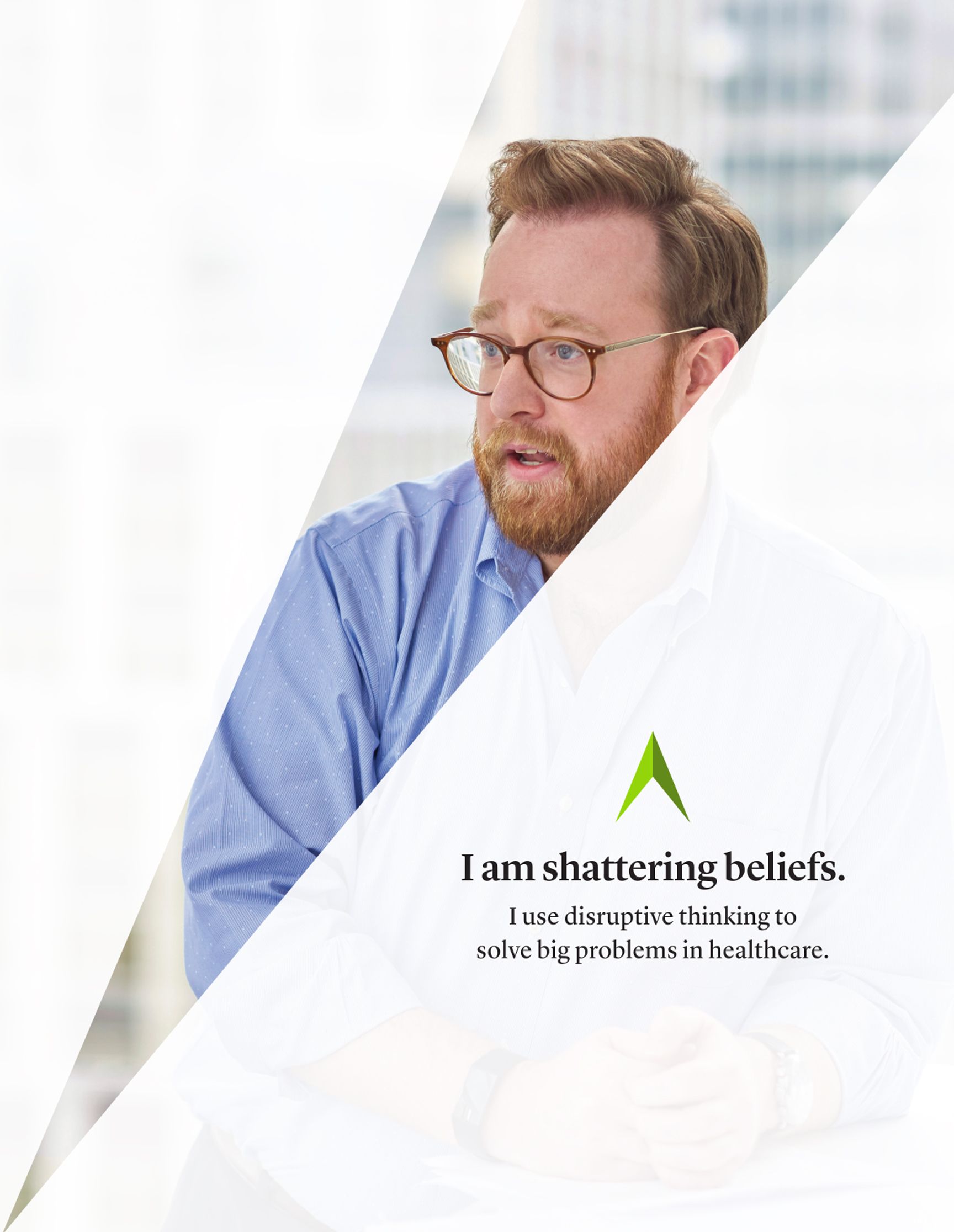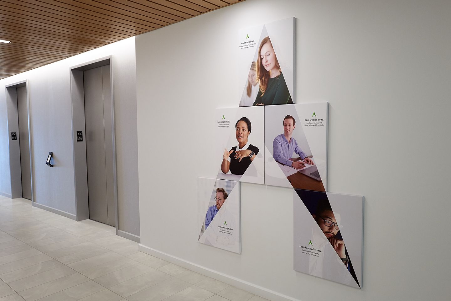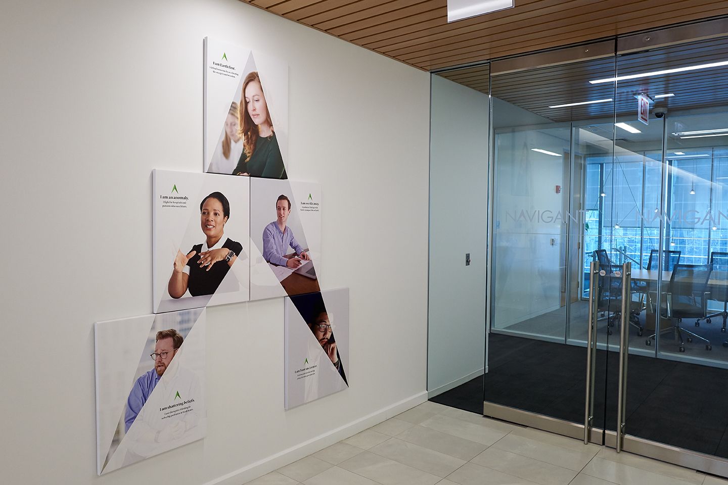 Navigant Consulting engaged Starfish to develop an internal campaign to empower employees and ultimately shift their understanding of themselves from tactical performers to contributors with higher-order impact. Starfish created a series of posters spotlighting individual employees. Each unique headline was derived from one-on-one interviews, supported by sophisticated photography of the subject framed by an enlarged piece of the Navigant logomark. The poster designs were purpose-built to live both in isolation and in a unified manner. The posters are displayed in Chicago and New York offices.