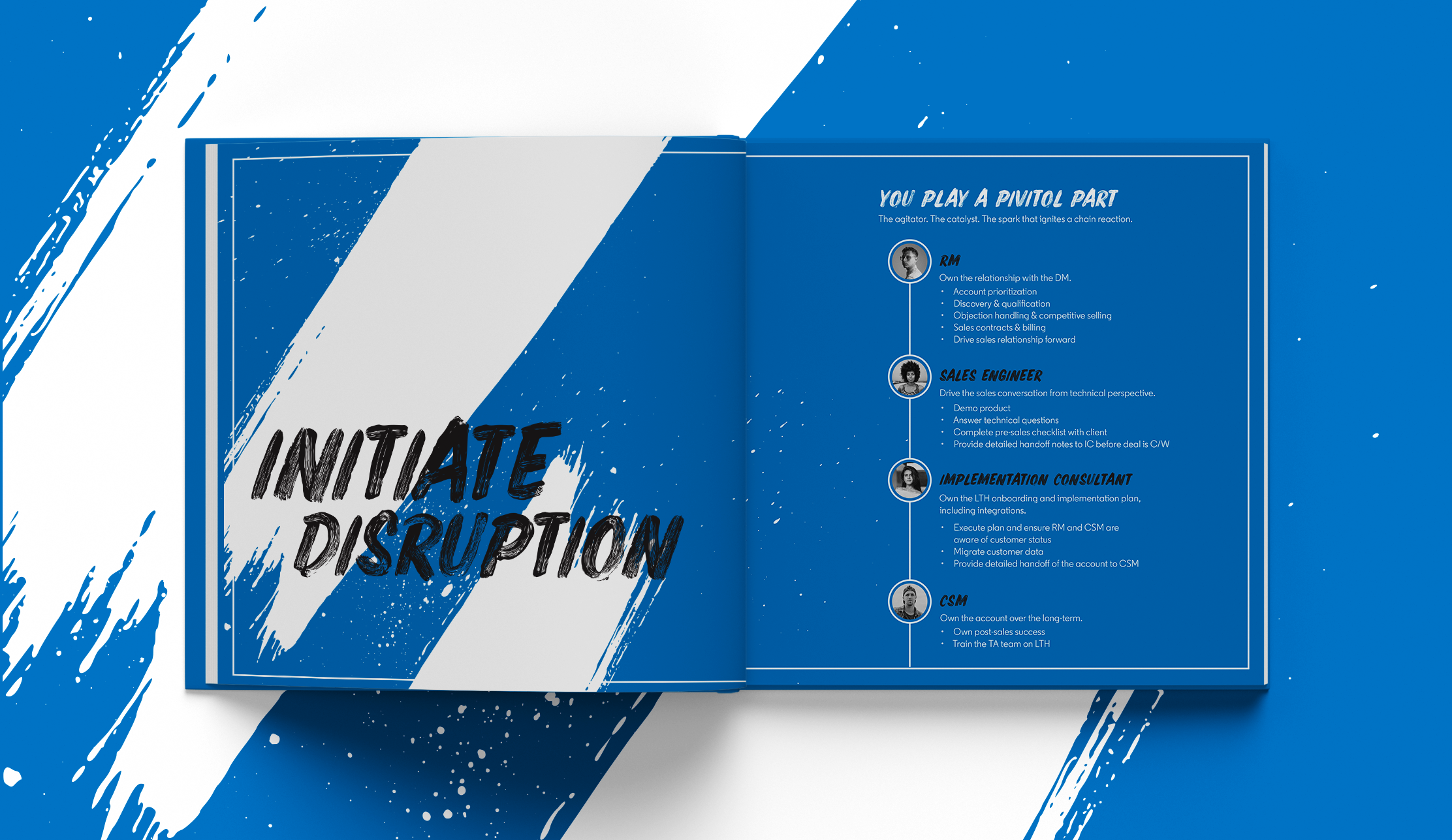 LinkedIn recently launched a new applicant tracking system called Talent Hub that integrates with other LinkedIn products to help companies better source, manage, and hire candidates on one single platform. Our challenge was to create a booklet that informs sales reps of the new game-changing product and inspires them to disrupt the market. We chose a design loosely inspired by the French revolution using graphical elements that speak to the idea of strength, grit, and nonconformity. Pushing the theme of ‘perseverance’, we balanced each page with bold photography and motivational copy.