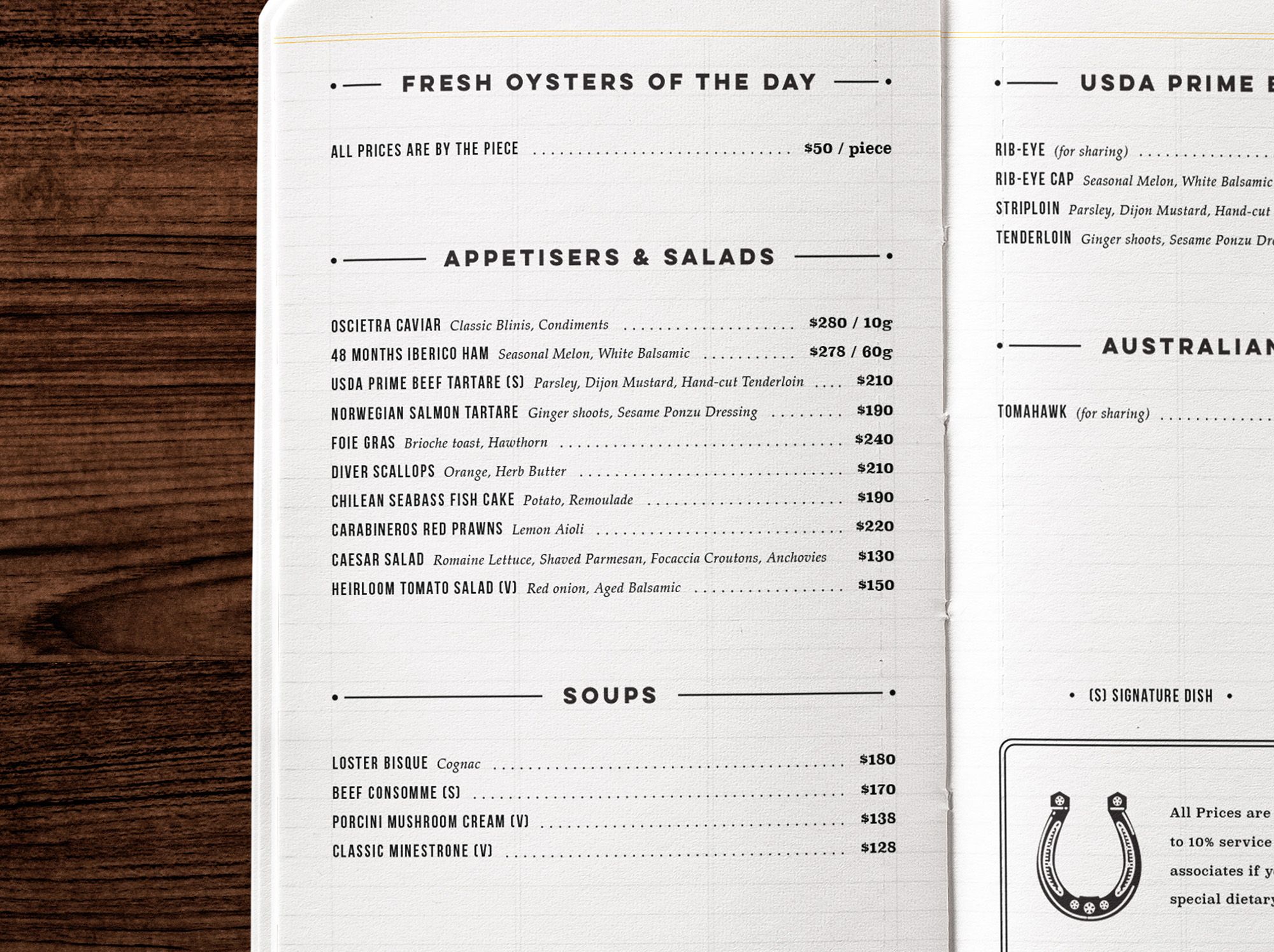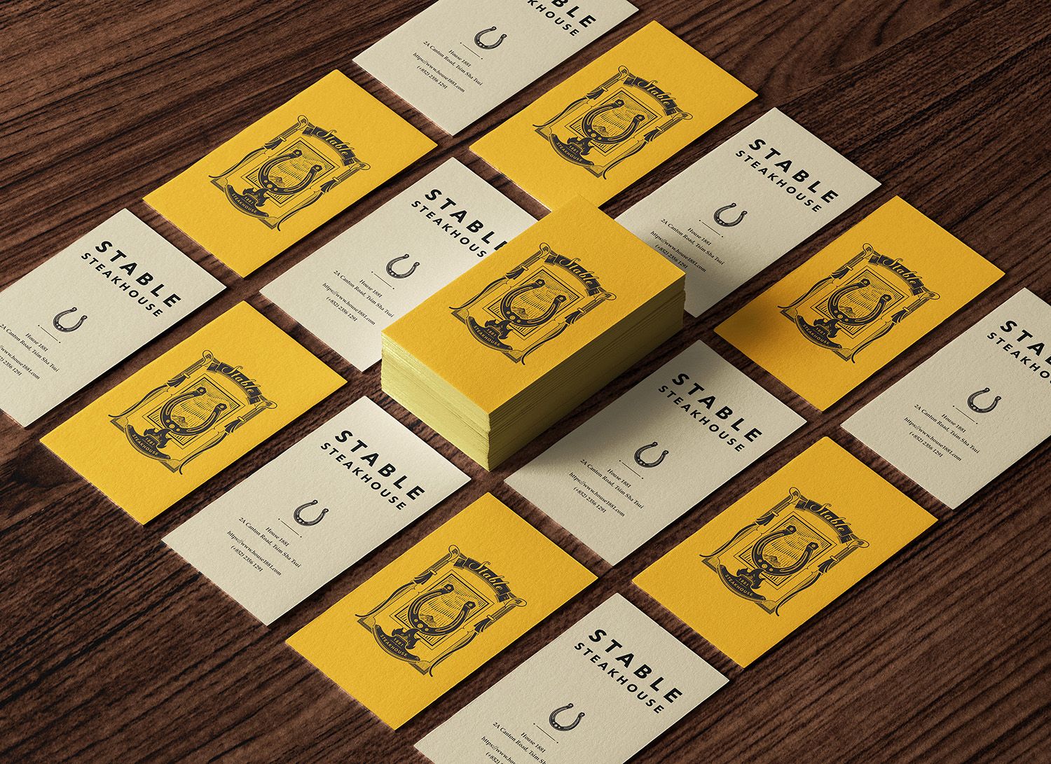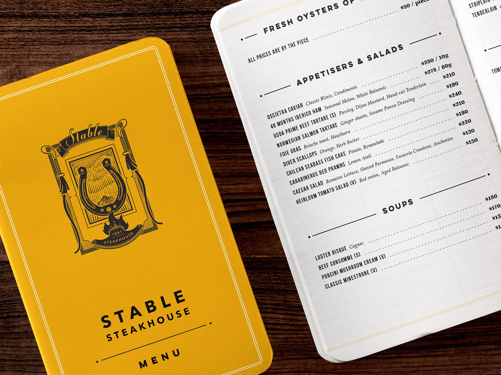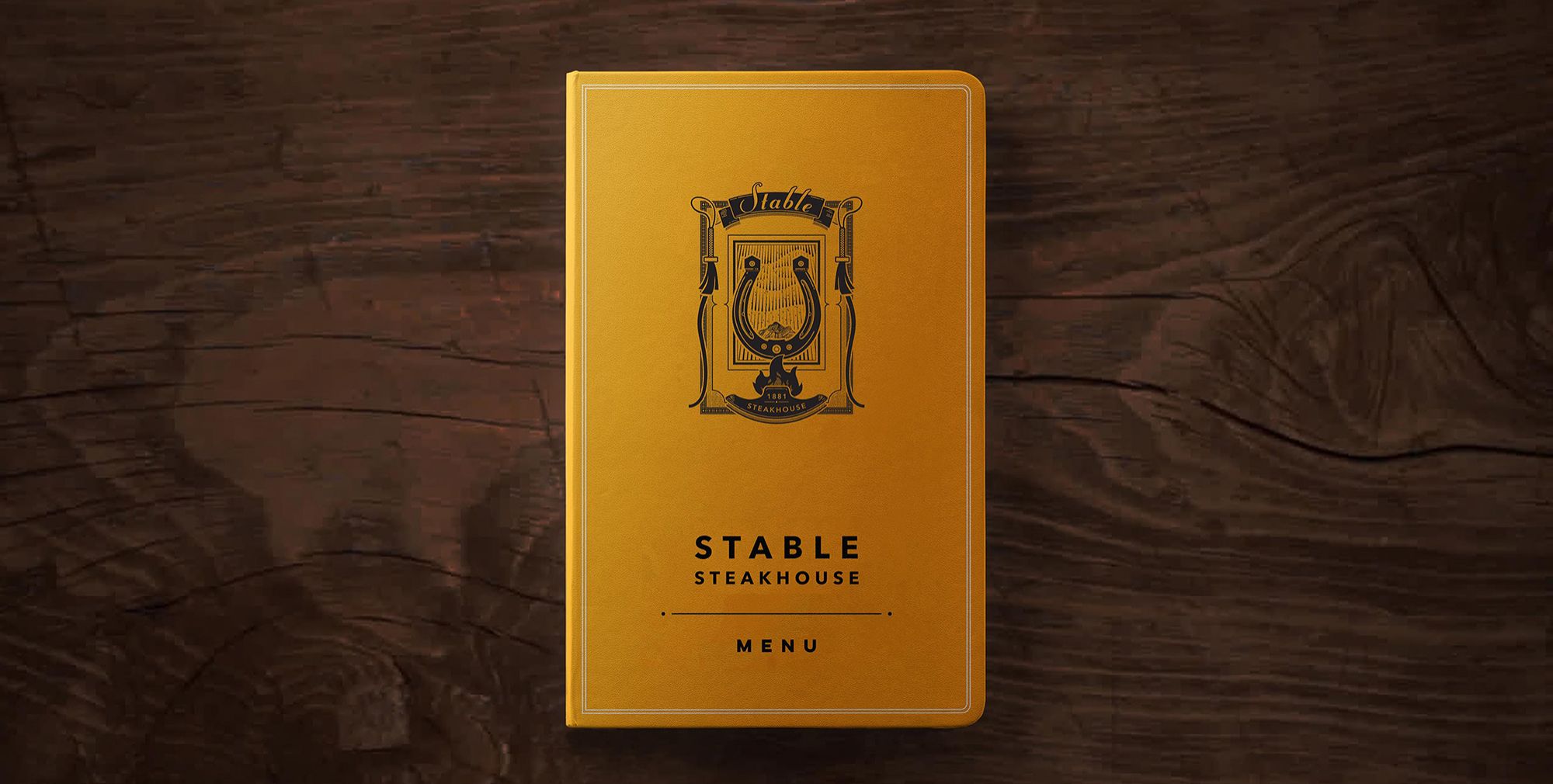 Stable is a grill restaurant and gin bar transformed from a real stable in the 18th century. Much of the restaurant interior still uses the wood from ships of the era. The intricate logo design is inspired by vintage wood etching artworks. Centered with a horseshoe, lined by two crops, the vintage emblem depicts a grill with smoke trailings, cooking up a perfect storm. The restaurant menu takes form of a vintage handbook, with an eclectic mix of contemporary typography and an iconic yellow leather cover that brightens up the vintage wood interiors.