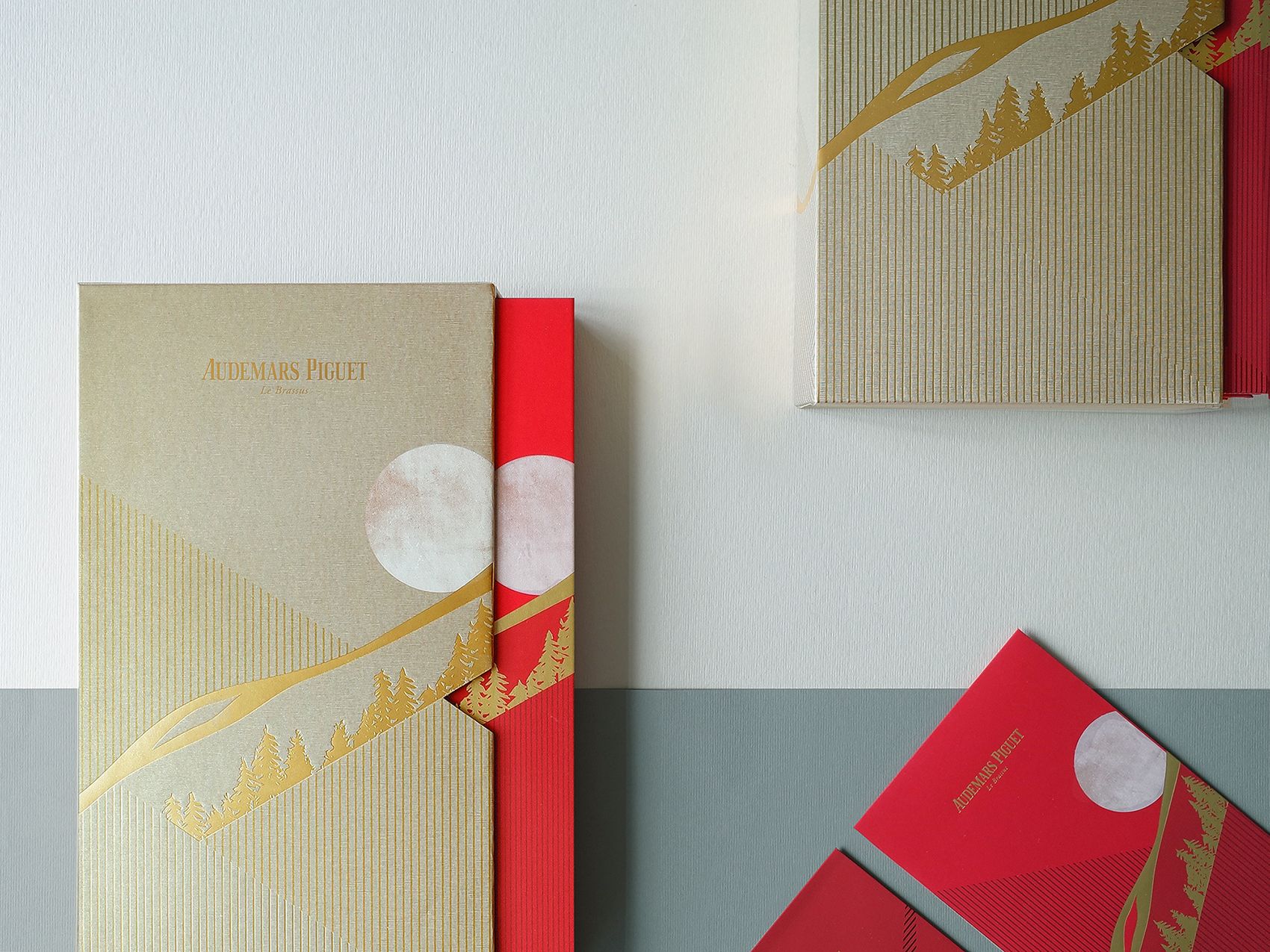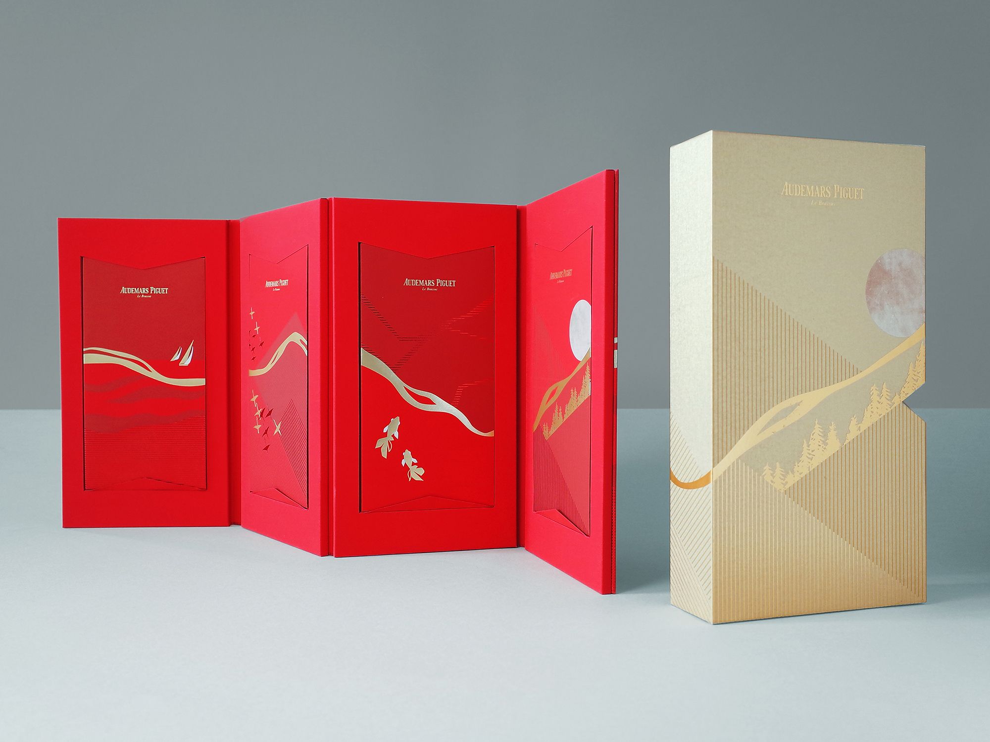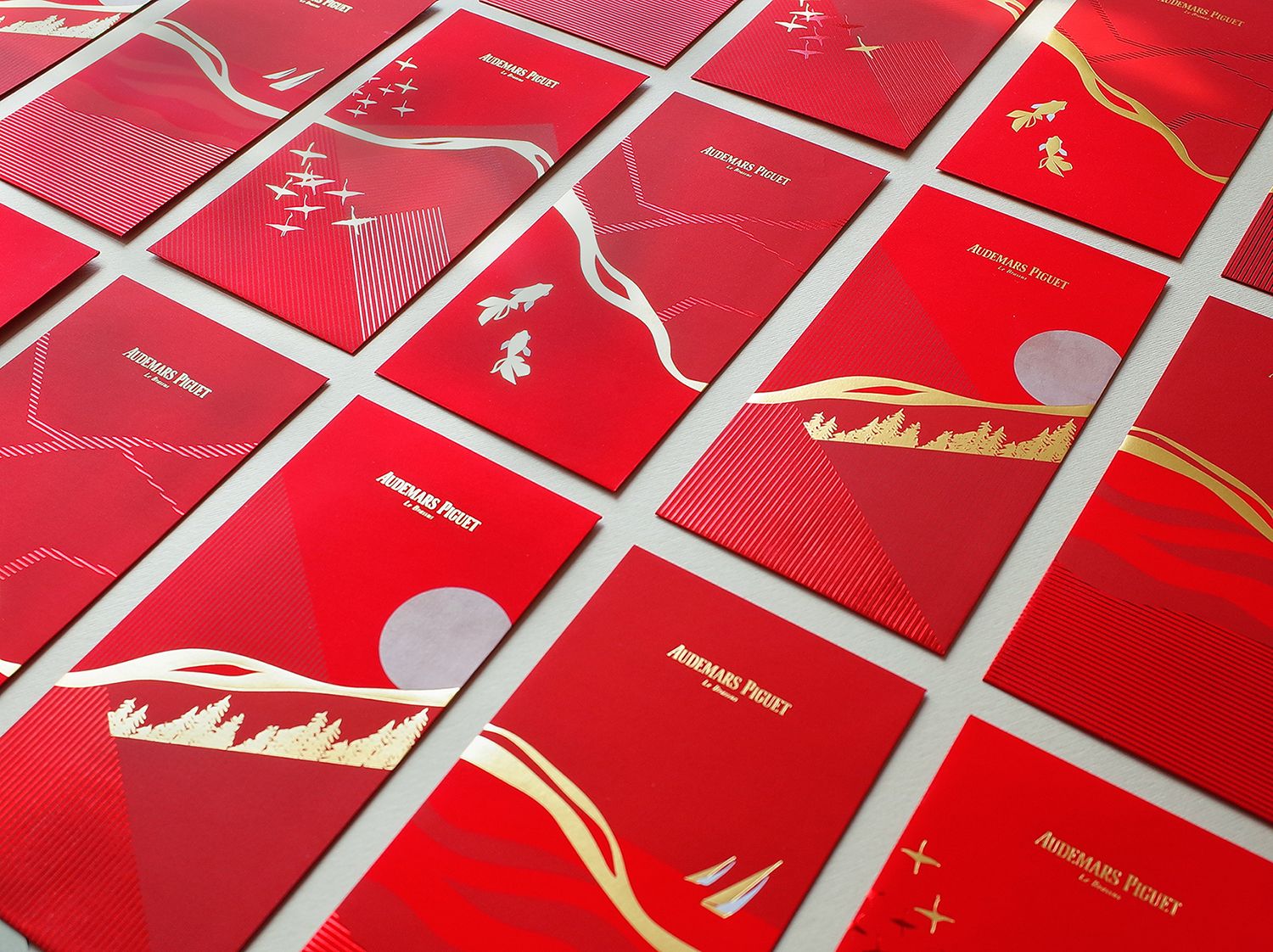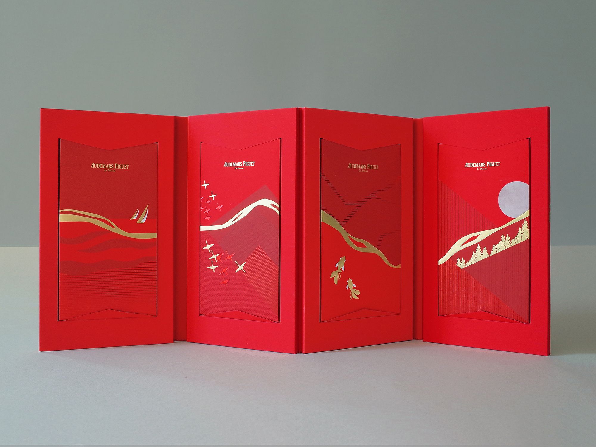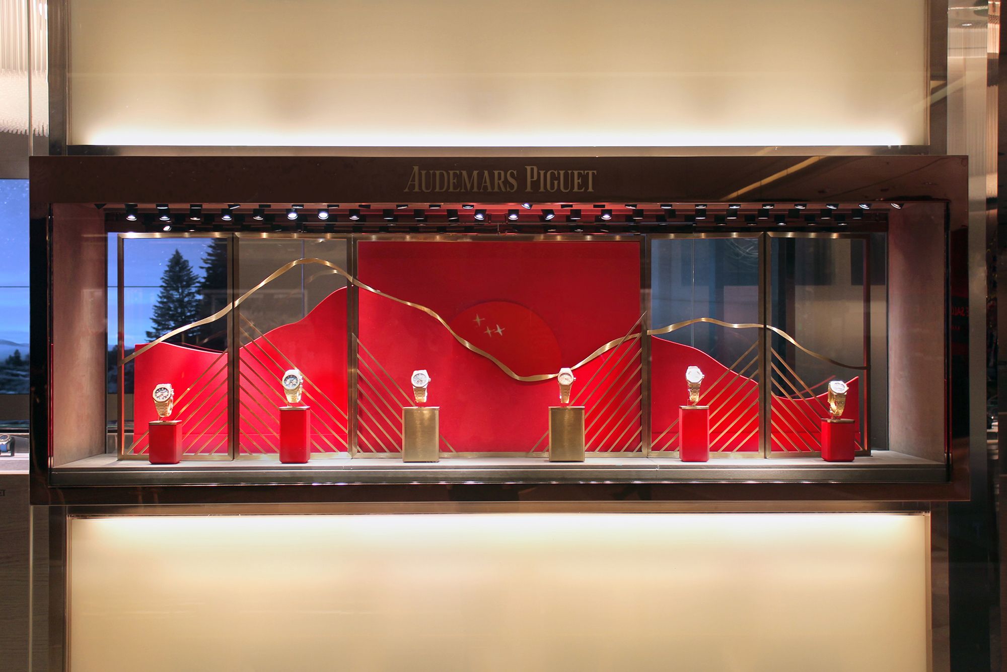 Our design concept stems from the historic Chinese “Ping Feng”- namely the decorative folding screens on which fine art was painted. In the lucky palette of red and gold, we created a series of elegant artworks on each panel to represent a traditional festive greeting, joint together in a golden mountainous silhouette, inspired by brand’s origin in Le Brassus Switzerland. The window displays similarly exhibit a festive flair, with a circulating sun depicting the return of the festive seasons, and flying cranes in motion highlights the perpetuation of seasons and time.