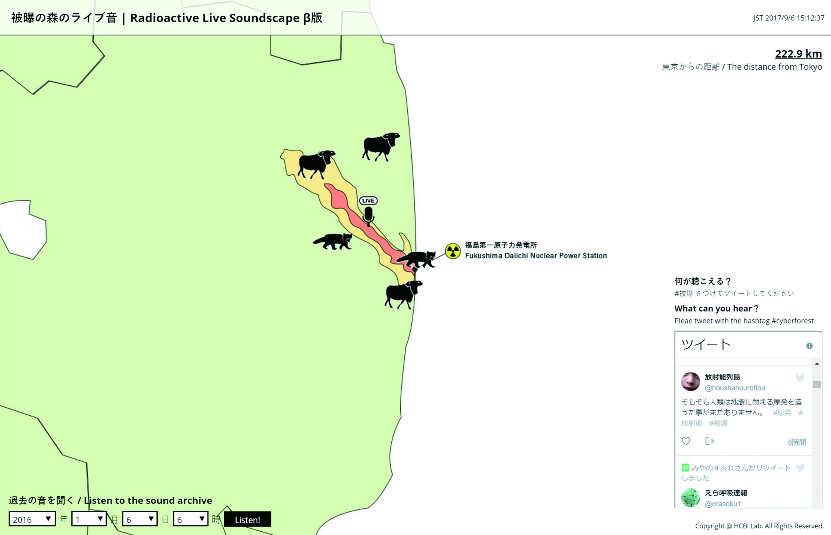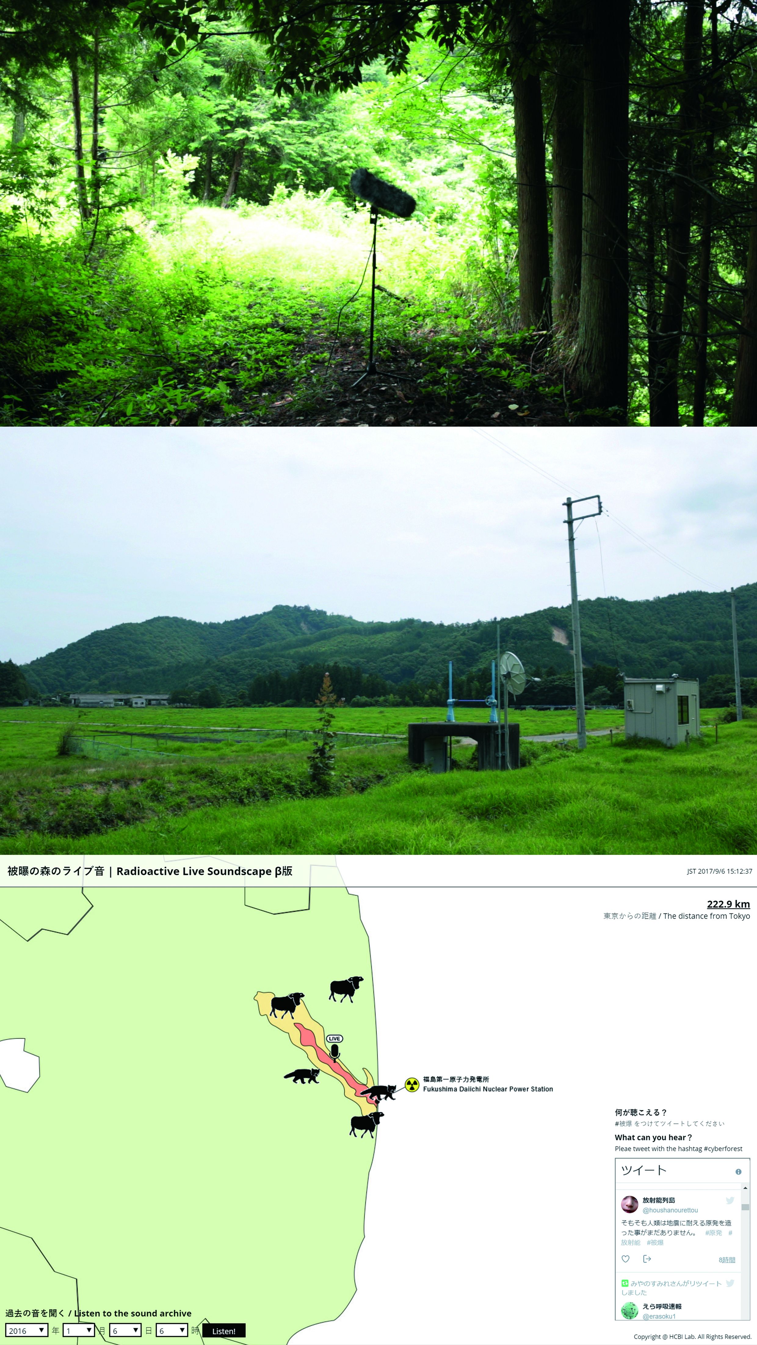 According to the Chernobyl nuclear disaster report of the International Atomic Energy Agency, it is academically and socially important to conduct ecological studies concerning the levels and effects of radiation exposure on wild animal populations over several generation. The artist constructed one Acoustic Ecology Data Transmitter in Exclusion Zone (Namie, Fukushima, Japan), 10 km from Fukushima Daiichi Nuclear Power Plant. It aims to transmit and store a live stream of sound from an unmanned remote sensing station in the area.These data to prove useful for future observations.