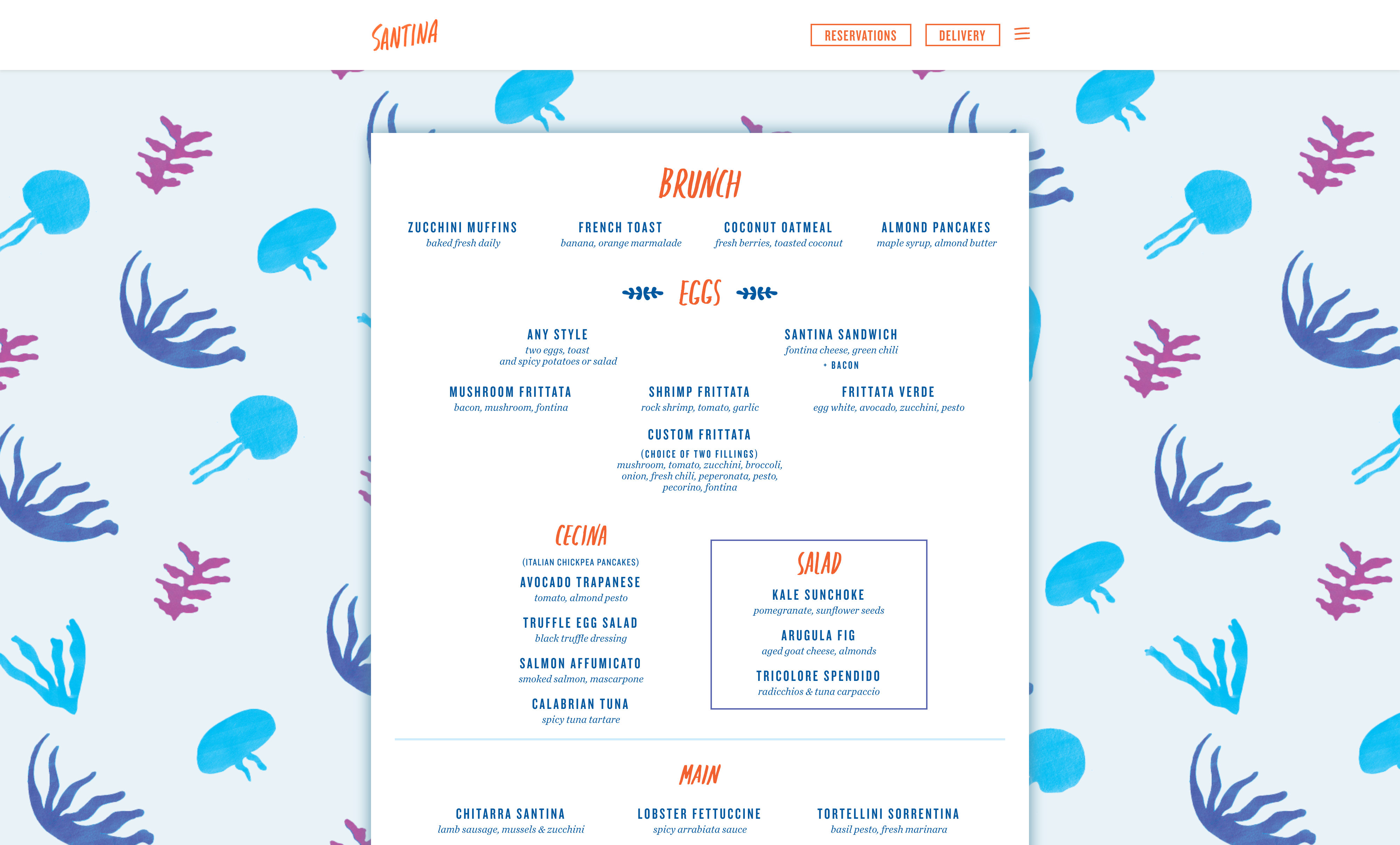 Santina approached Happy Cog with a design refresh in mind and this led to a total redesign of santinanyc.com. The redesign incorporates beautiful photography and illustration of the restaurant, the menu, and the feeling of the Italian Amalfi Coast. We migrated their site over to a new WordPress CMS in order to simplify the process for the Santina team when making updates to their site. Their team can now easily customize Santina’s menus and make edits to them as needed with the added benefit of all of their dishes, cocktails, and even their team being indexable in Google.