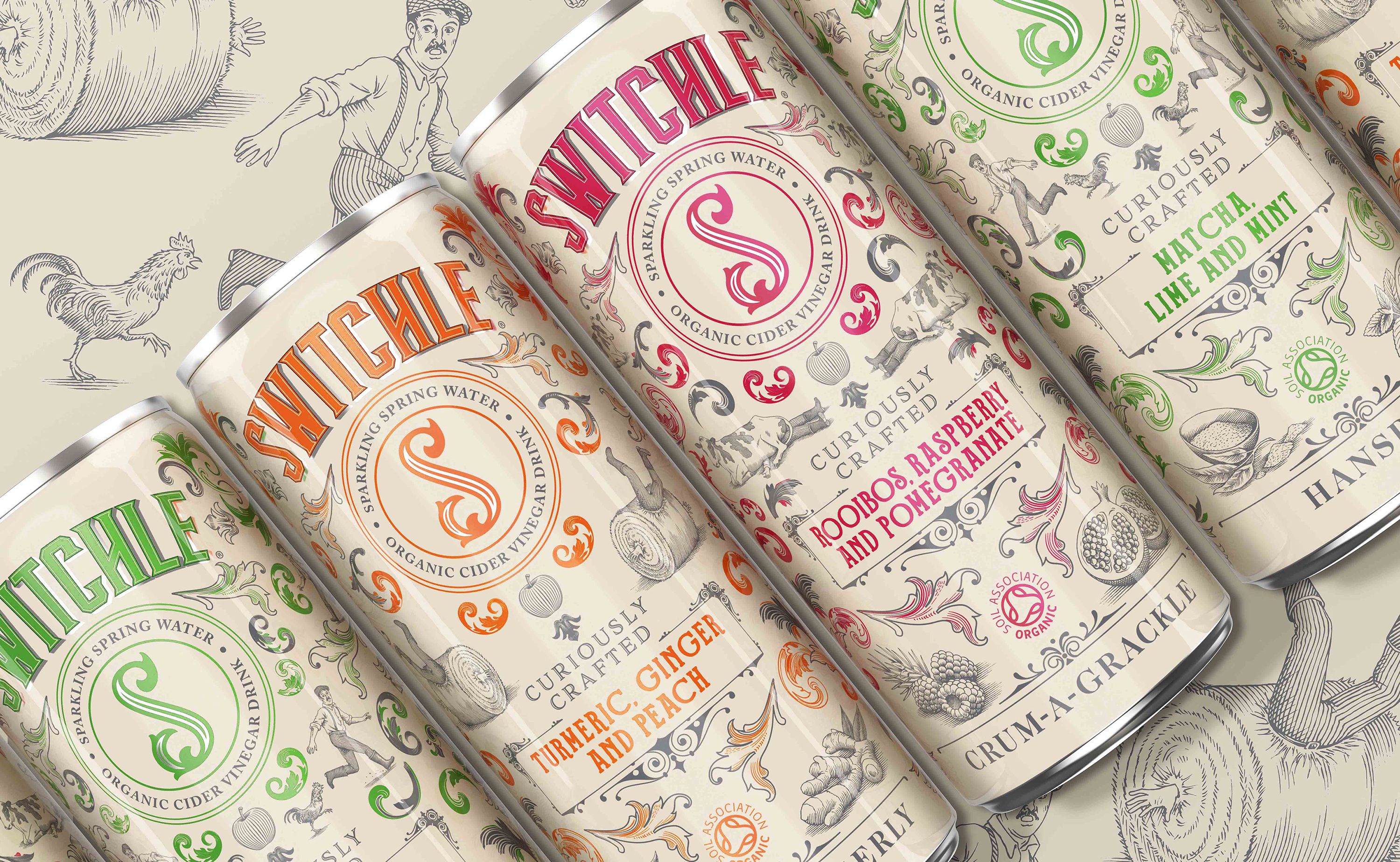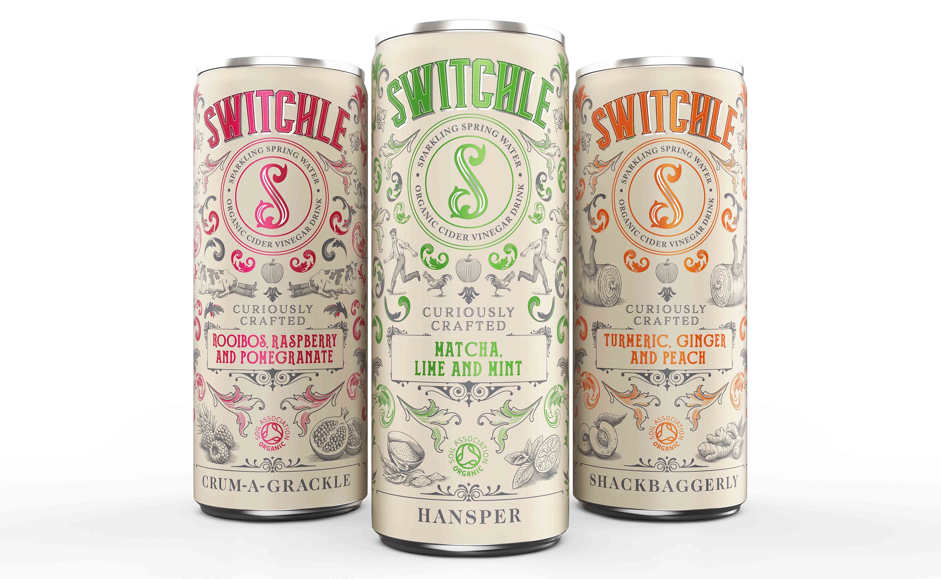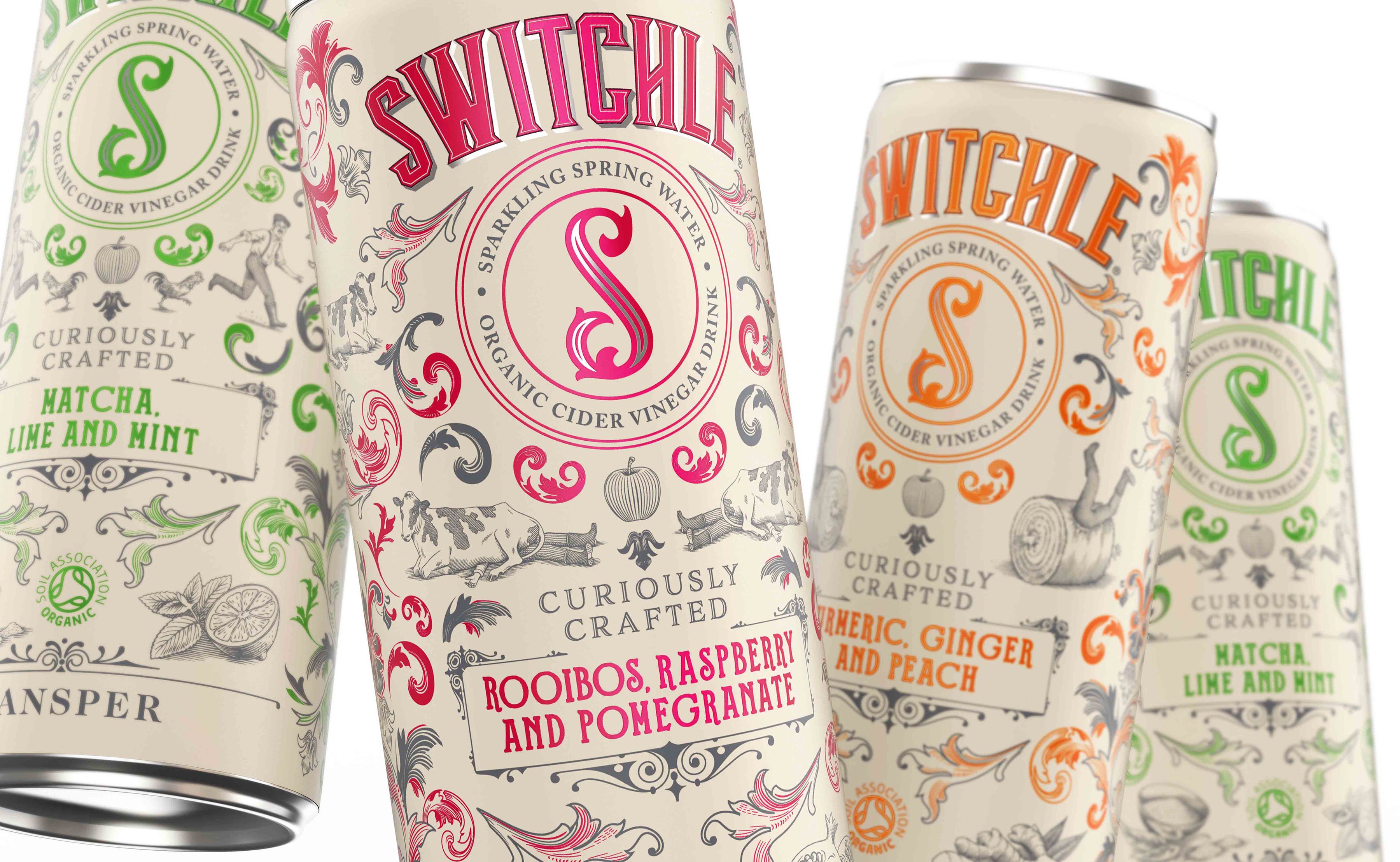 P&W created the branding for Switchle - a refreshing fermented organic soft drink formulated with apple cider vinegar and other healthy, invigorating goodies. The design solution for Switchle’s highly distinctive taste profiles was to produce a uniquely ownable identity that taps into its 17th century farming connection. British eccentricity was captured via illustration, typography and quirky Olde English phrases. The design features an ‘S’ roundel; a transferable brand marque that stands out on-shelf. The result - a "curiously crafted" design that represents an intriguing tipple.