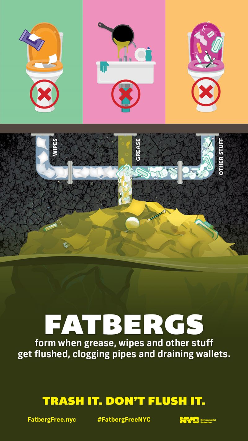 Every day, people flush things down their toilets and sinks and don't think twice. What they don't realize is that these materials, like grease and "flushable" wipes, combine in the sewers to create "Fatbergs" that clog pipes and cause serious issues.This fully integrated campaign educates New Yorkers on this issue and the simple behavior changes they can do to help fix it. Brightly illustrated visuals paired with an upbeat tone encourage New Yorkers to properly dispose of waste by trashing it, not flushing it.