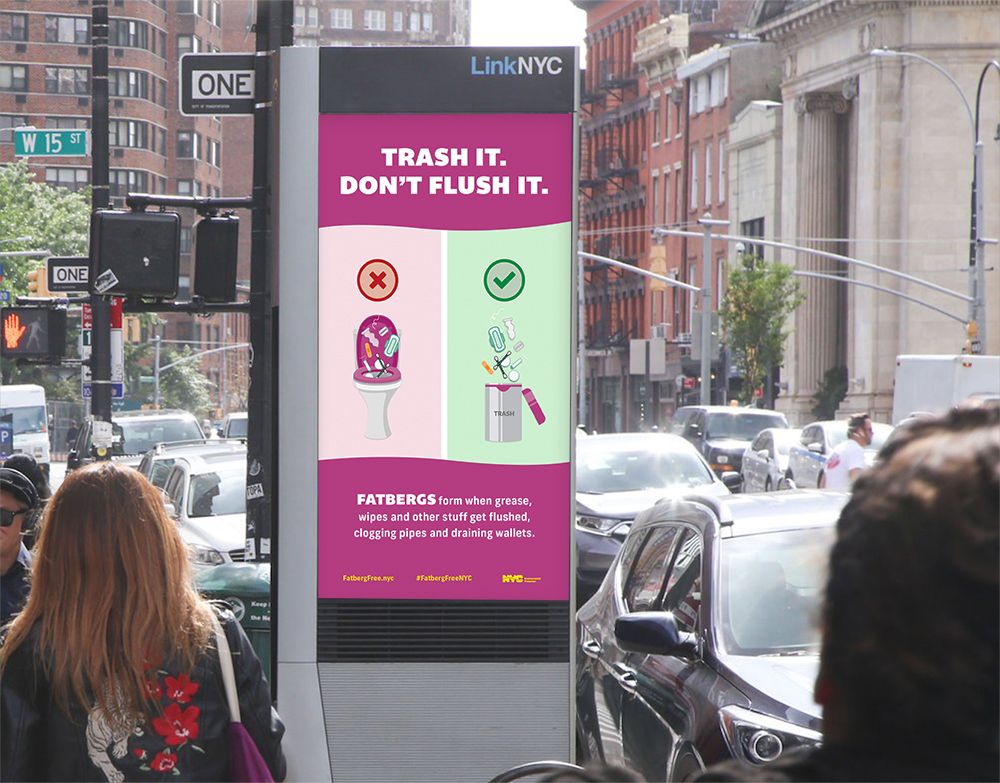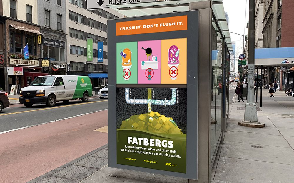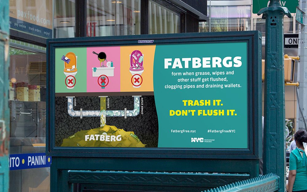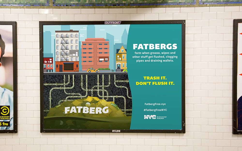 Every day, people flush things down their toilets and sinks and don't think twice. What they don't realize is that these materials, like grease and "flushable" wipes, combine in the sewers to create "Fatbergs" that clog pipes and cause serious issues.This fully integrated campaign educates New Yorkers on this issue and the simple behavior changes they can do to help fix it. Brightly illustrated visuals paired with an upbeat tone encourage New Yorkers to properly dispose of waste by trashing it, not flushing it.