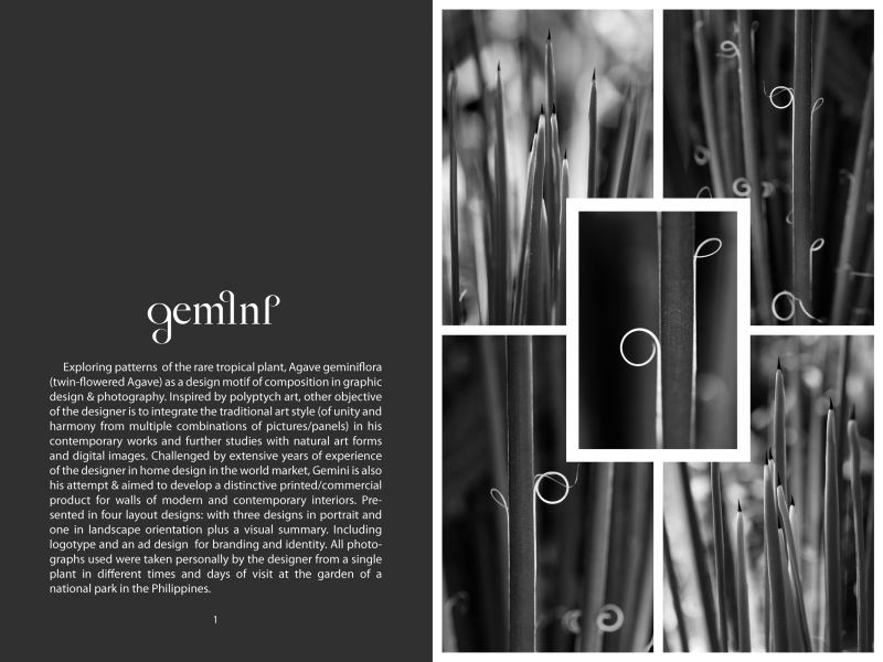 Exploring patterns of the rare tropical plant, Agave geminiflora (twin-flowered Agave) as a design motif of composition in graphic design and photography. Inspired by polyptych art, other objective of the designer is to integrate the traditional art style (of unity and harmony from multiple combinations of pictures/panels) in his contemporary works with natural art forms and digital images. Challenged by years of experience of the designer in home design in the world market, Gemini is also his attempt and aimed to develop a distinctive printed/commercial product for walls of modern interiors.